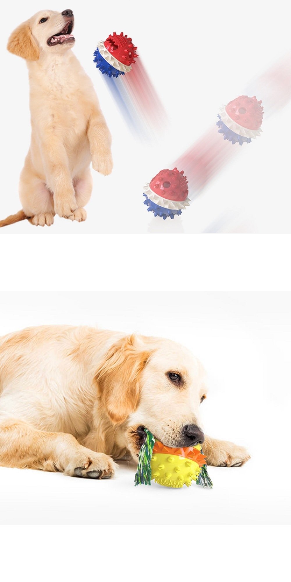 1.[4 In 1 Multifunctional Ball] Upgraded Molar squeaky bouncing treat ball with bite cotton rope, food dispensing ball, designed with large sphere, thick sphere wall, which can more resist to dog's biting, there are multiple molar bumps that can fully protect dog's dental health.