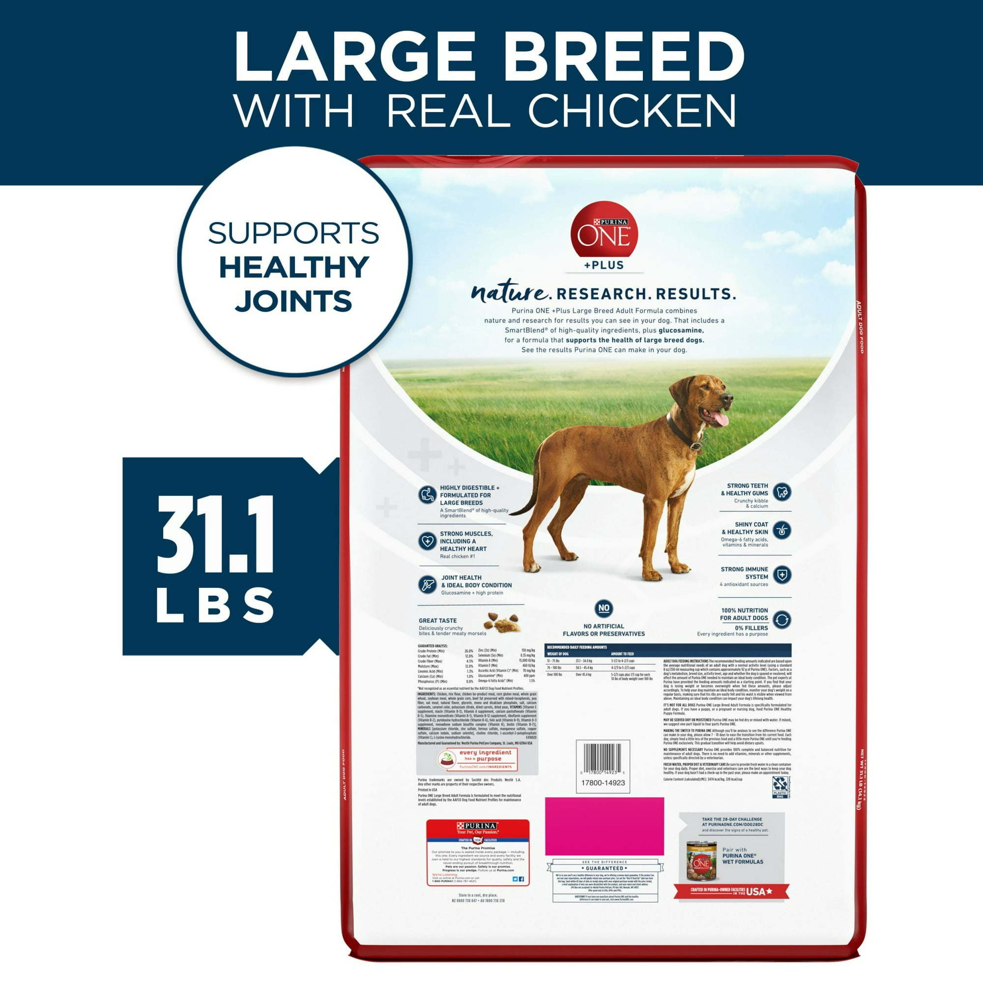 Provide your large breed dog with the nutrition their big body needs to keep them going strong by serving Purina ONE Plus Adult Dry Dog Food Large Breed Formula. This Purina ONE dry dog food for adult dogs comes packed with a SmartBlend of high-quality ingredients tailored to promote the health of large breeds. Each serving is a high-protein dog food with the nutritional support needed to support strong muscles, including a healthy heart and features real chicken as the number one ingredient. To support their skin and coat and help them look their healthy and shiny best, Omega-6 fatty acids, along with dog vitamins and minerals, are added to this dog kibble for results you can see. Since it’s vital for large breed dogs to maintain mobility by getting hip and joint support, this formula provides nourishing glucosamine for dogs. Each serving of this natural dog food with added vitamins, minerals, and nutrients will excite them with deliciously crunchy bites and tender meaty morsels that provide the Purina ONE dry dog food taste and textures dogs love with added calcium to promote strong teeth and healthy gums. To ensure that more nutrition goes to work inside your dog, this large breed Purina ONE dry dog food is designed to be highly digestible. Help your gentle giant of a canine get what their body needs to thrive by giving them the 100 percent complete and balanced nutrition of Purina ONE Plus Adult Dry Dog Food Large Breed Formula.